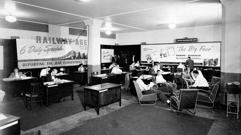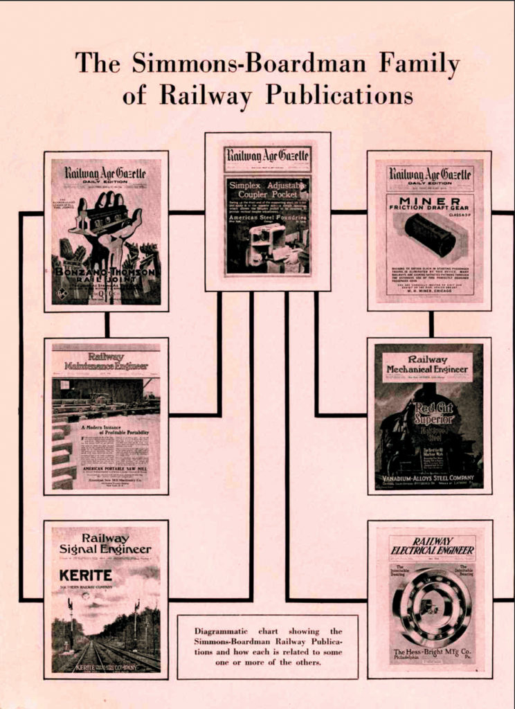 Why did Simmons and Boardman want to acquire The Railway Age? “While, prior to the merger, The Railroad Gazette had the greater prestige, it was losing ground in circulation and in advertising to its livelier, more enterprising Chicago rival,” Railway Age noted in 1956. “Boardman himself admitted that The Railroad Gazette was ‘edited for student railroad presidents and there were never enough of them.’” The combined magazine “reflected the character of both ancestral lines. It continued the Age’s alertness to the news of the industry. It continued the thorough exposition and interpretation of technical aspects of railroad operation that it had inherited from the Gazette. Altogether, it was a stronger paper than either and began at once a steady climb in circulation and advertising revenues. Starting out with about 4,000 subscribers on the Gazette and the Age apiece (many of which were duplicated), it pushed circulation to 10,000 by 1929—despite its policy of limiting promotion of sale of the paper to readers of railway officer status.”