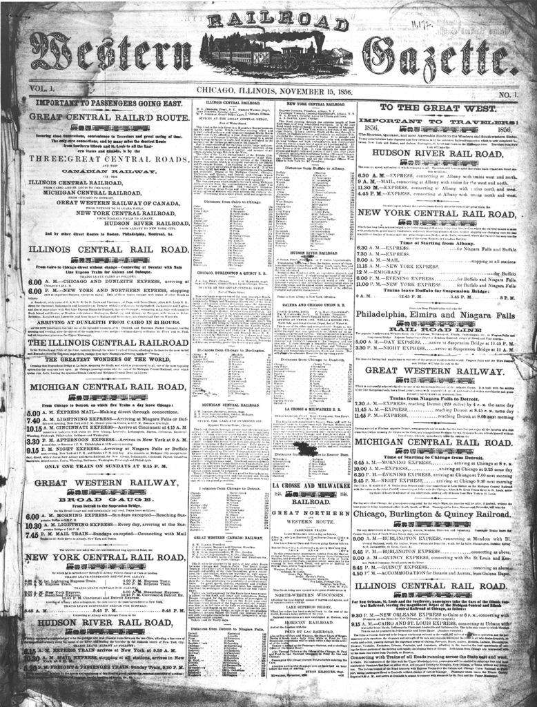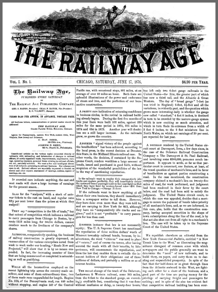 Back to the beginning: The Western Railroad Gazette was a very different publication from its descendants. It was founded at the Chicago Tribune as a publicly circulated periodical, not a trade publication. “It wasn’t much of a paper, to put it bluntly,” wrote the editors in Railway Age’s 1956 centennial issue. “It was not a business paper at all, in fact. It didn’t do a business paper’s job. It was not addressed primarily to the men who run railroads. There was not a line in its four littered pages that would help them build or run railroads better. Its audience was the public at large—chiefly the traveling public, and probably largely commercial travelers—most of whom got the paper free. Its chief advertisers were railroad companies. Other products and services hawked in its columns included hotels, clothing, patent medicines, tobacco, jewelry, banks, business schools, and stock brokerage. The editorial pages contained little of serious import to railroad men. They comprised mostly endless praises of the routes and services of the railroads that advertised, and horrendous tales of accidents, lateness, rudeness, and discomfort in the cars of their non-advertiser rivals.”