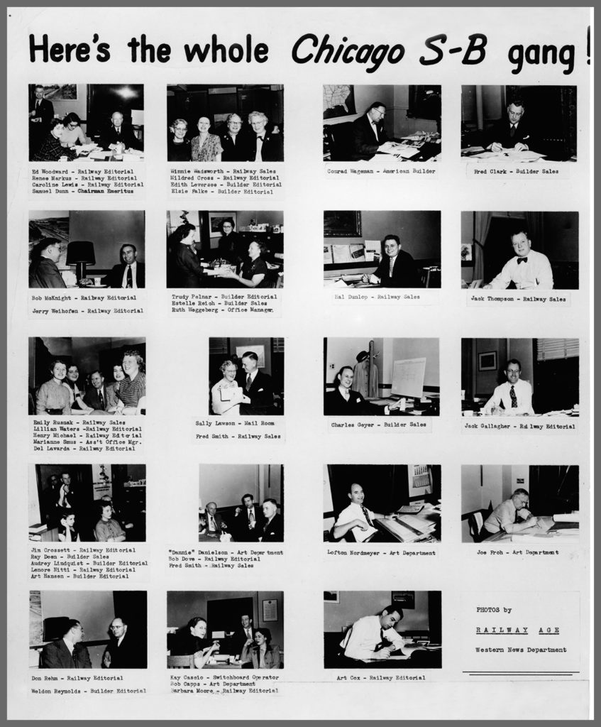 1912 marked a major turning point in the fortunes of Simmons-Boardman Publishing Corp. and set the company on a course to its present form. Simmons bought out Boardman’s holdings and became the owner of a majority of the company. Simmons, who died in 1931, extended the company’s properties to include trade publications in other industries. Active direction of the company passed to Dunn, chairman of the board. Upon Dunn’s retirement in 1950, James G. Lyne, who had been co-editor of Railway Age for two years, became editor as well as president of Simmons-Boardman. In 1954, controlling interest in the company was sold to a group of long-time employees, and Railway Age and its sister magazines became owner-operated properties. The principal stockholders were Lyne and Executive Vice President Arthur J. McGinnis Sr., both of whom started with the company as associate editors of Railway Age (McGinnis in 1940). Robert G. Lewis, who had joined Railway Age in 1947 as associate editor, was named publisher of the company’s railway group in 1956.